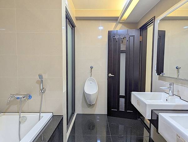 飯店式雙洗手台 乾濕分離規劃 有浴缸及男性使用小便斗